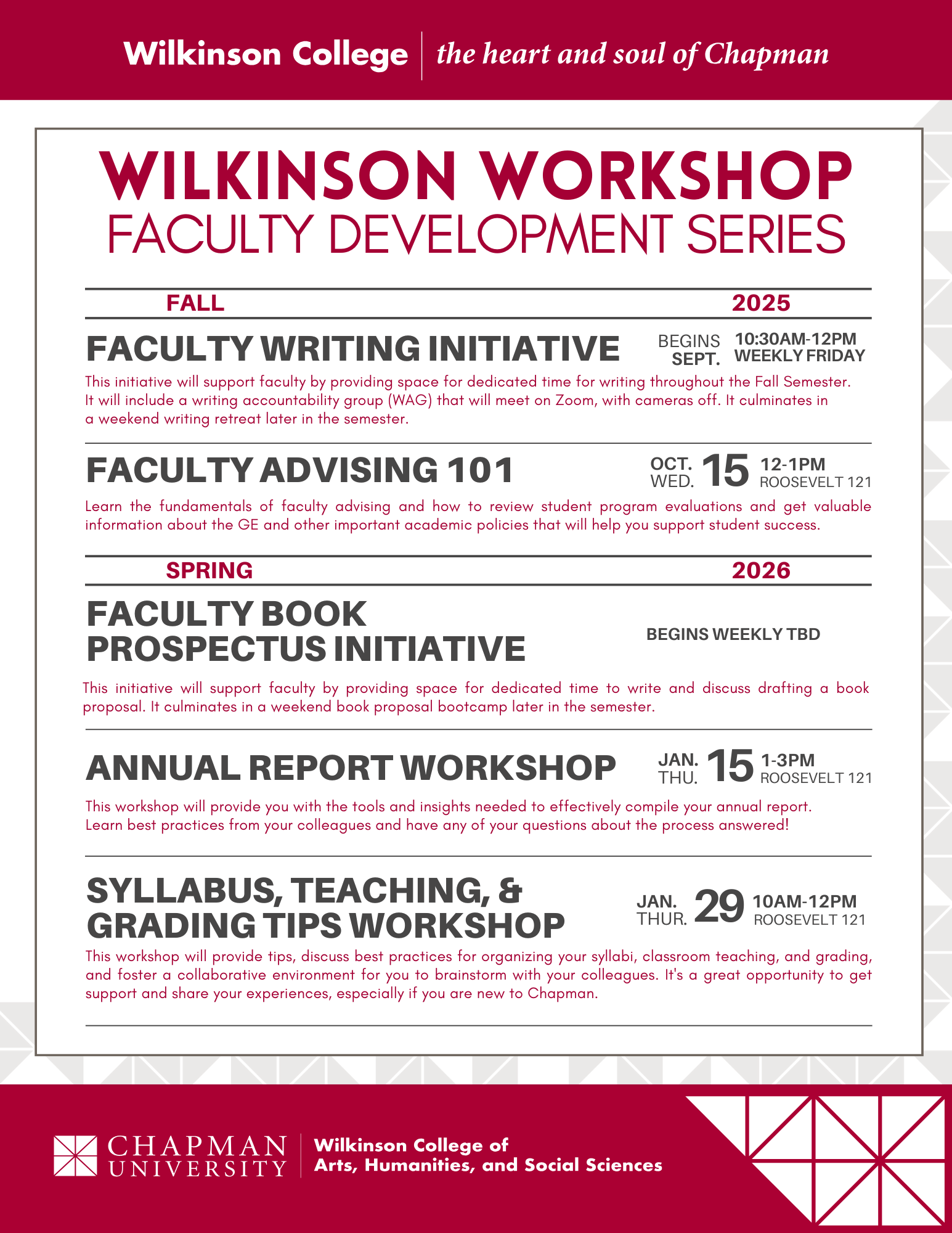 - Faculty Writing Retreat: Jan. 12, 13, 14 (Chapman)