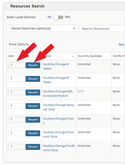 *11) Event Resources: This is where you will identify all the resources you will need for your event like tables, audio/visual equipment, catering, etc. Please note: if you are having trouble finding a resource, try using the More Options, Categories. Make sure to look for resources at your location(Orange/Rinker) To change Quantities/assignments, Add the number of resources needed then Click on request.