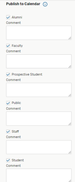 *15) Publish to Calendar: Select which audiences this event is intended for. This information will be added to your events calendar listing.
