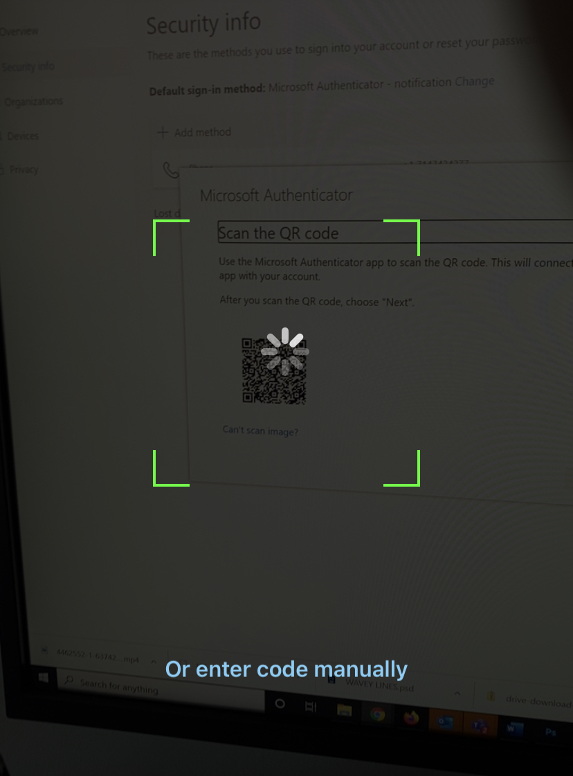 - Using the QR scanner in the Authenticator App, scan the QR code on your computer screen.