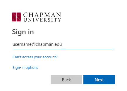 - At the Chapman University login page, enter your email address again, followed by your Chapman password. Click