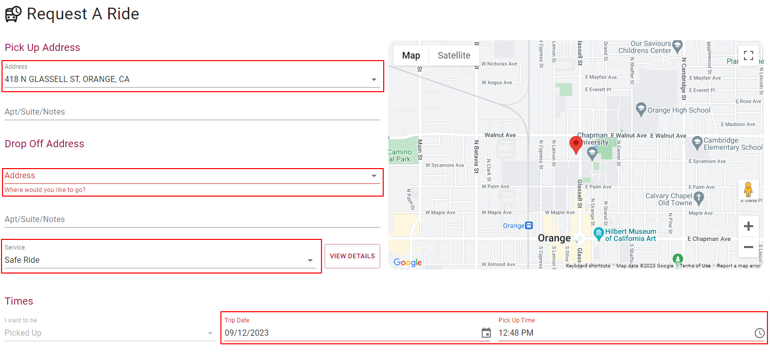 Note: Pay close attention to the Service drop-down menu. There are two options: before midnight and after midnight. The Service must be adjusted accordingly depending on the trip's time request. (See image below) Requesting a Safe Ride