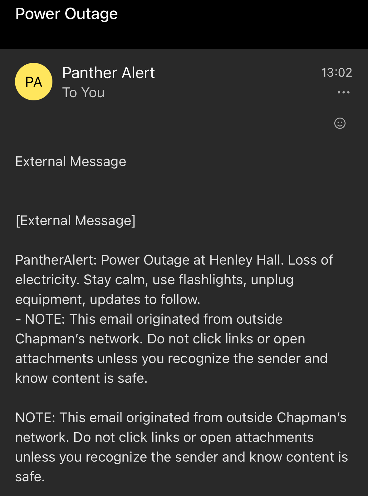 To ensure you receive timely alerts, it is essential that your emergency contact information is accurate and up to date. Panther Alert can simultaneously send voice calls, text messages, and emails to you and your designated emergency contacts during an emergency affecting the Chapman community.