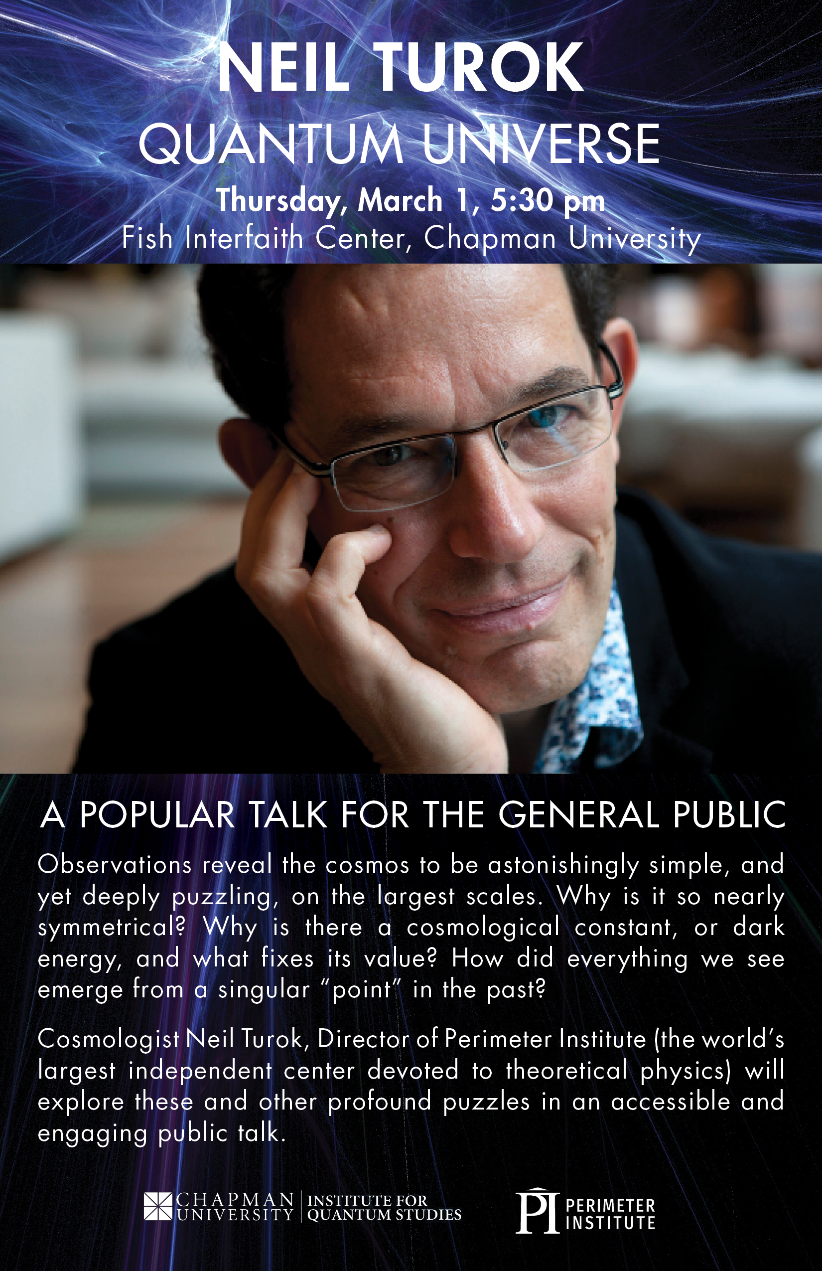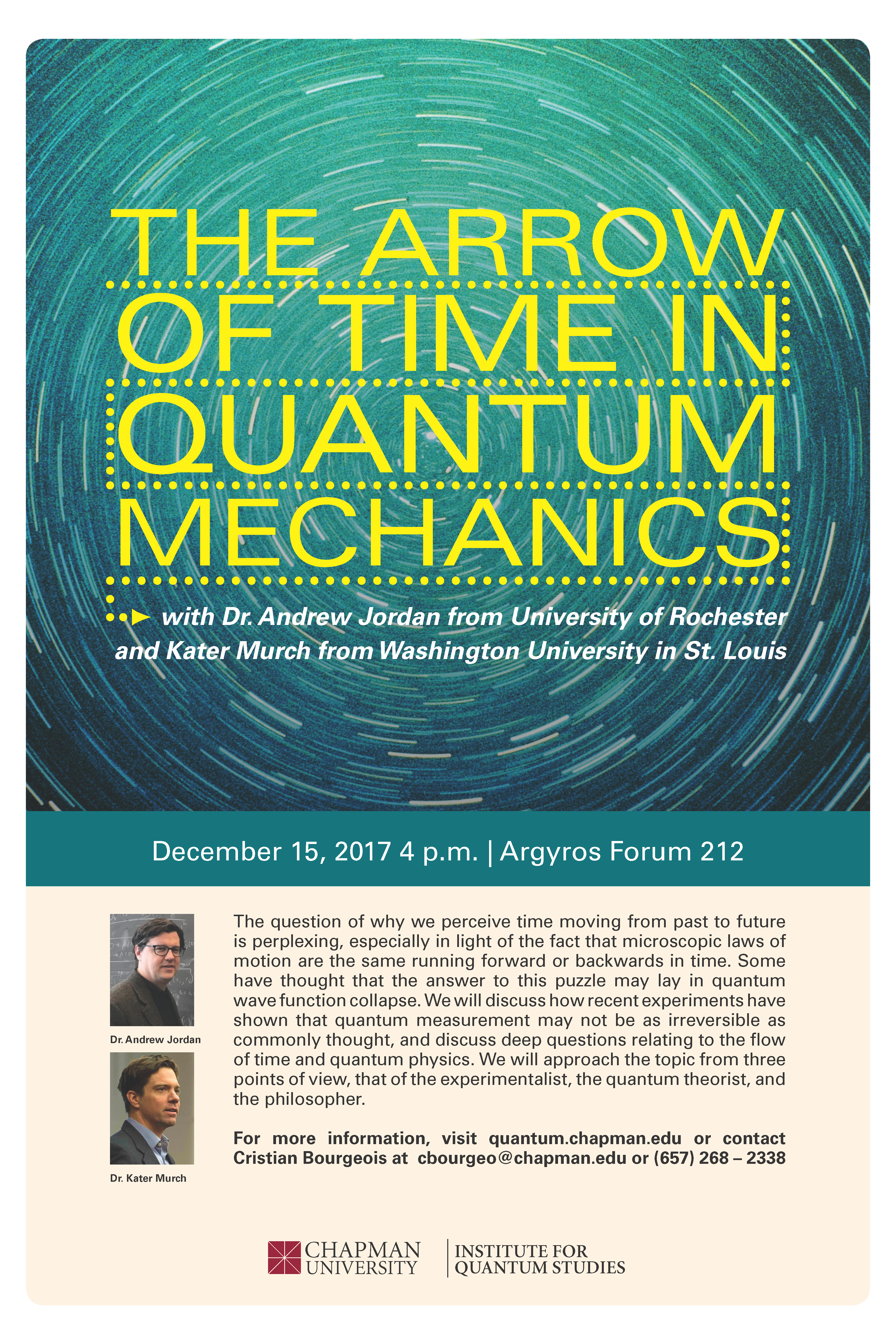 The Institute for Quantum Studies at Chapman University presents an online discussion between Dr. Rob Spekkens (Perimeter Institute) and Dr. Matthew Leifer (co-Director of the Institute for Quantum Studies at Chapman) on quantum causality. Robert Spekkens received his B.Sc. in physics and philosophy from McGill University and completed his M.Sc. and Ph.D. in Physics at the University of Toronto. He held a postdoctoral fellowship at Perimeter Institute and an International Royal Society Fellowship at the University of Cambridge. He has been a faculty member at Perimeter Institute since November 2008. His research is focused upon identifying the conceptual innovations that distinguish quantum theories from classical theories and investigating their significance for axiomatization, interpretation, and the implementation of various information-theoretic tasks. His recent work includes new approaches to understanding causality in quantum mechanics and beyond. The conversation will be broadcast live on YouTube at https://rebrand.ly/IQSSpekkens There will be an opportunity for audience Q&A after the event.