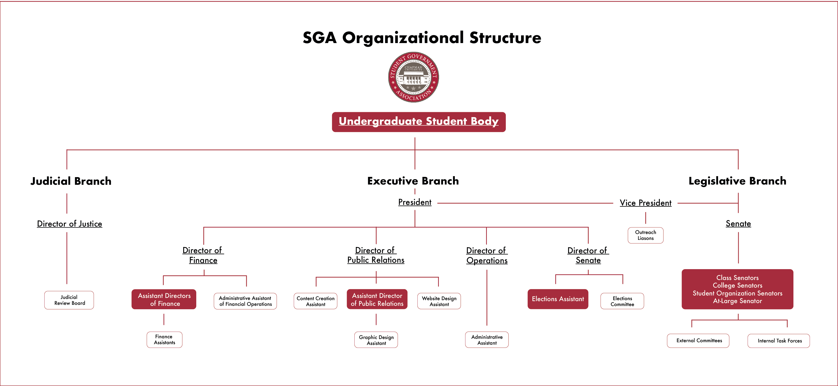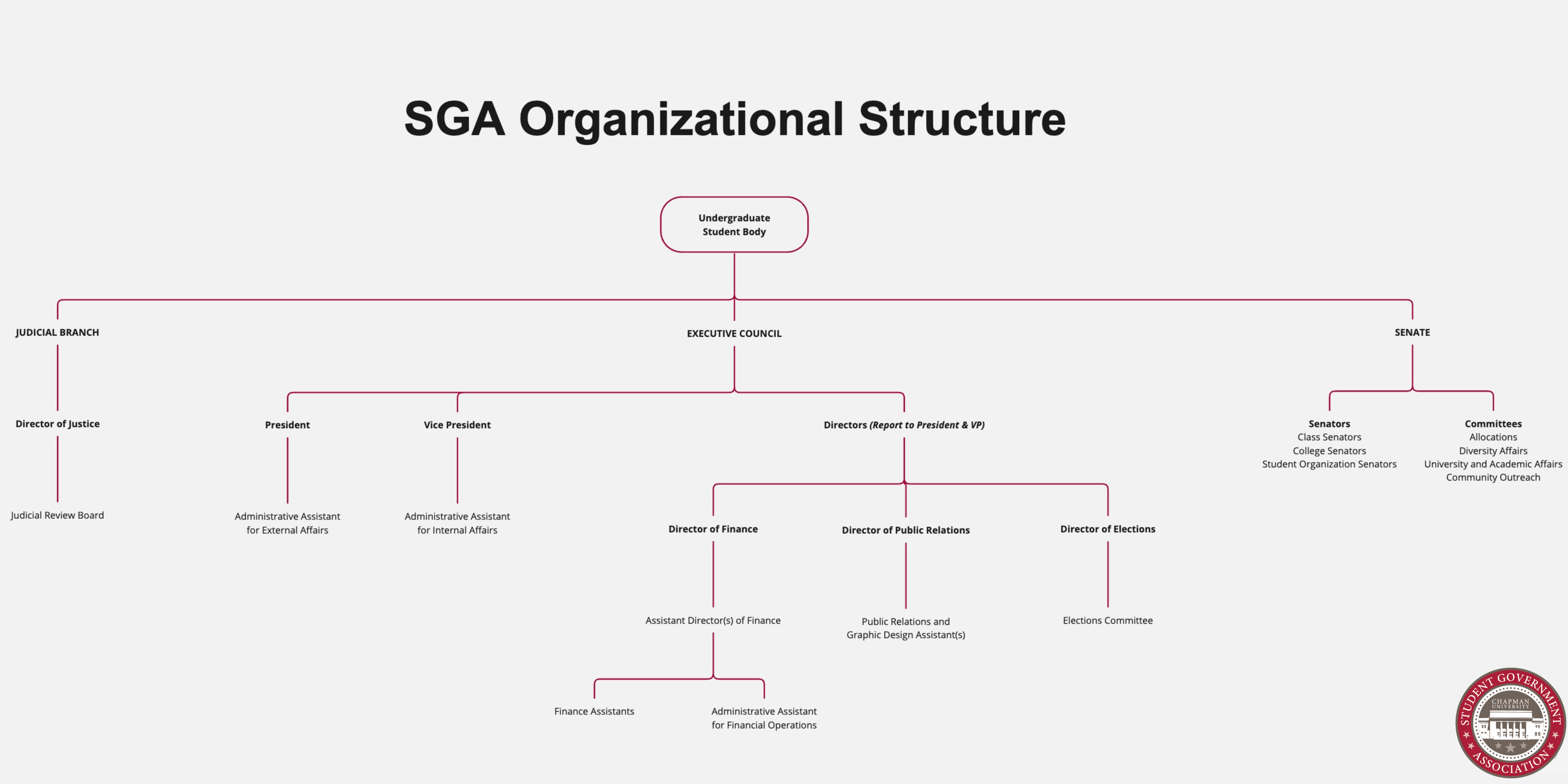 President: The President is ultimately responsible for the welfare of the entirety of SGA. They work with other members of the Executive