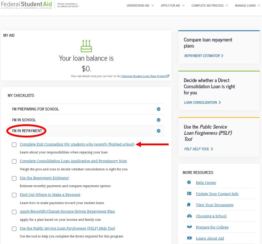 Federal Loan Exit Counseling can be completed online at StudentAid.govby logging in with your FSA ID Username and password and selecting "Complete Exit Counseling" from the "I'm In Repayment" drop-down menu.