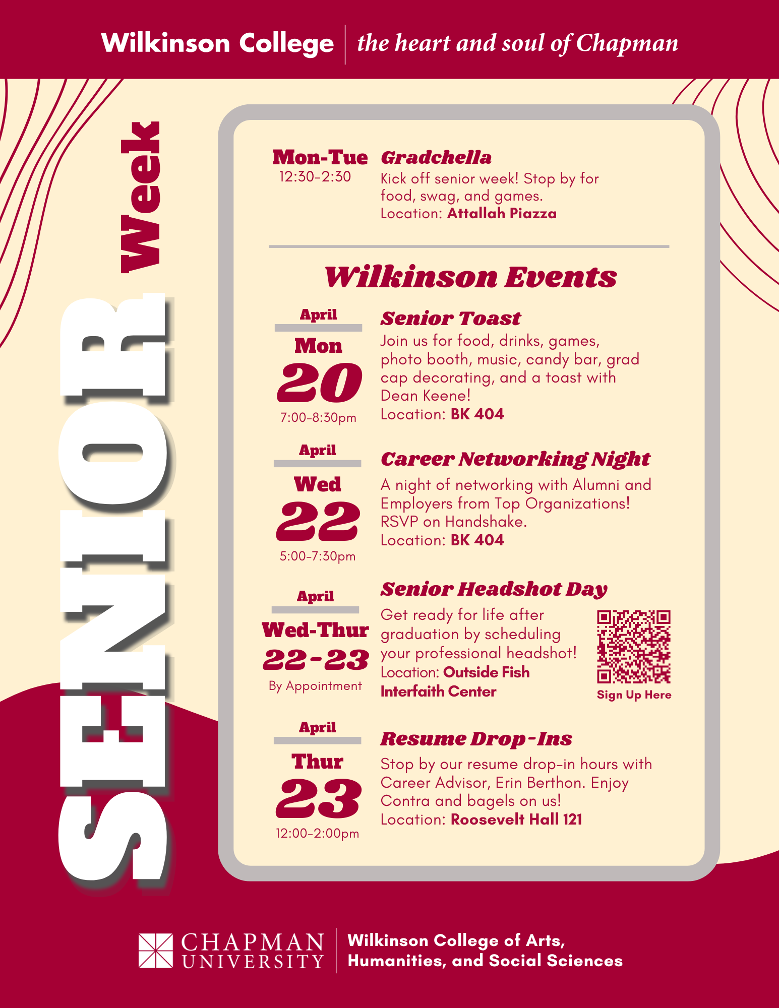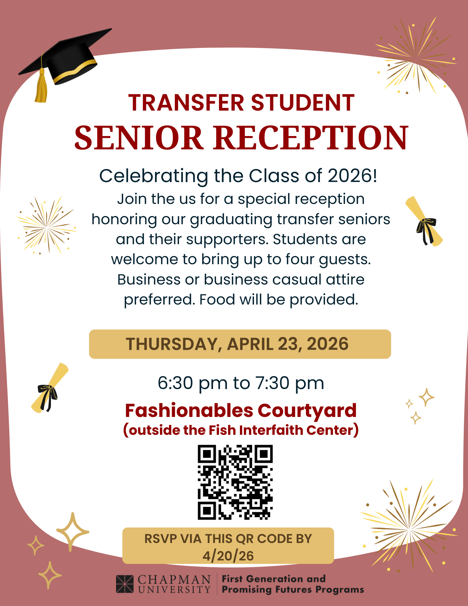 - Transfer Student Senior Reception: Apr. 23, 6:30 p.m.
