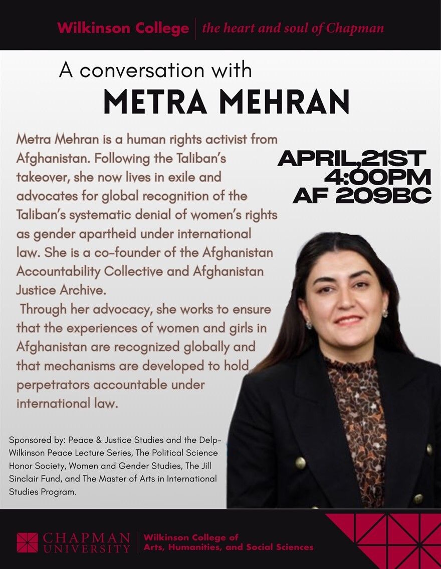- Convo with Metra Mehran: Apr. 21, 4 p.m.