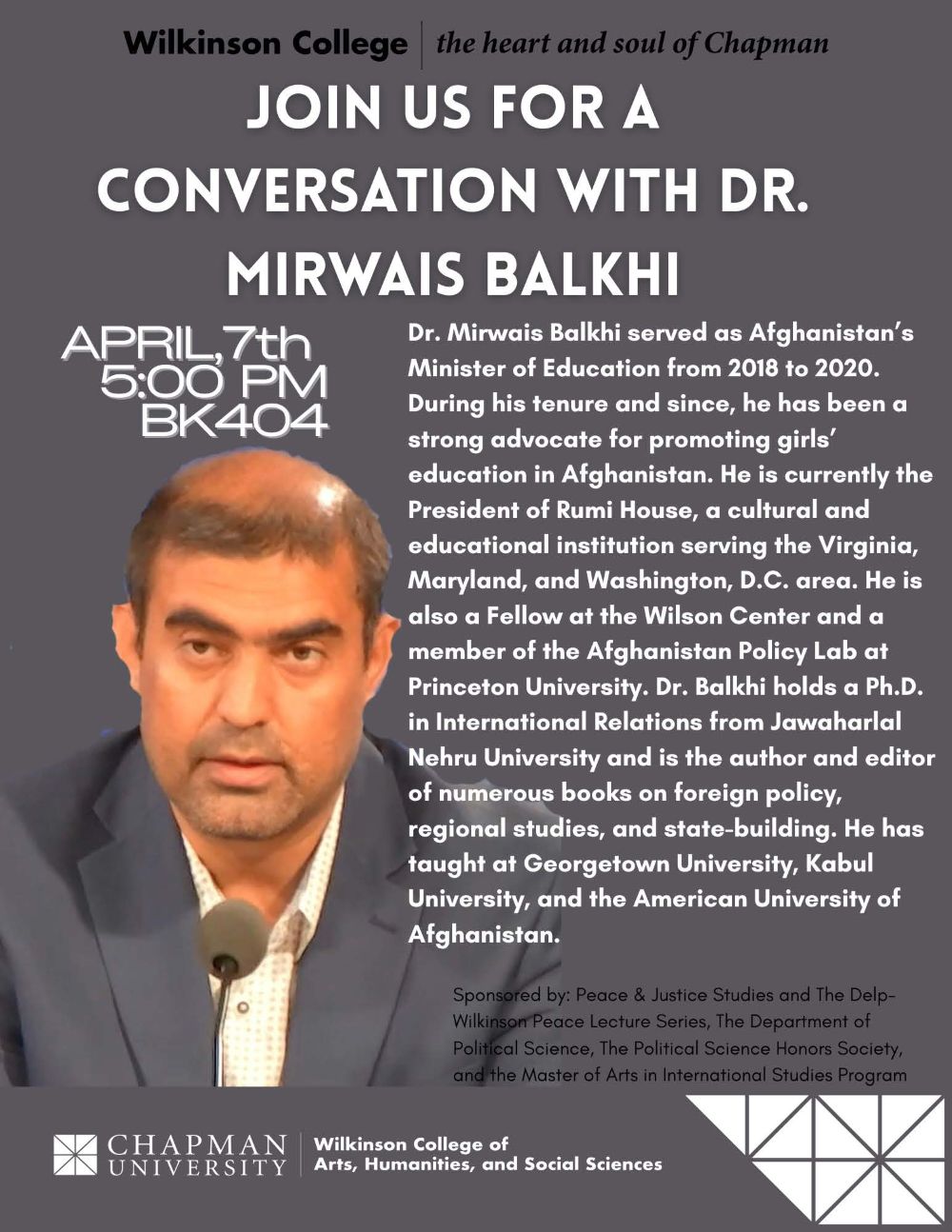 - Dr. Mirwais Balkhi: Apr. 7, 5 p.m.