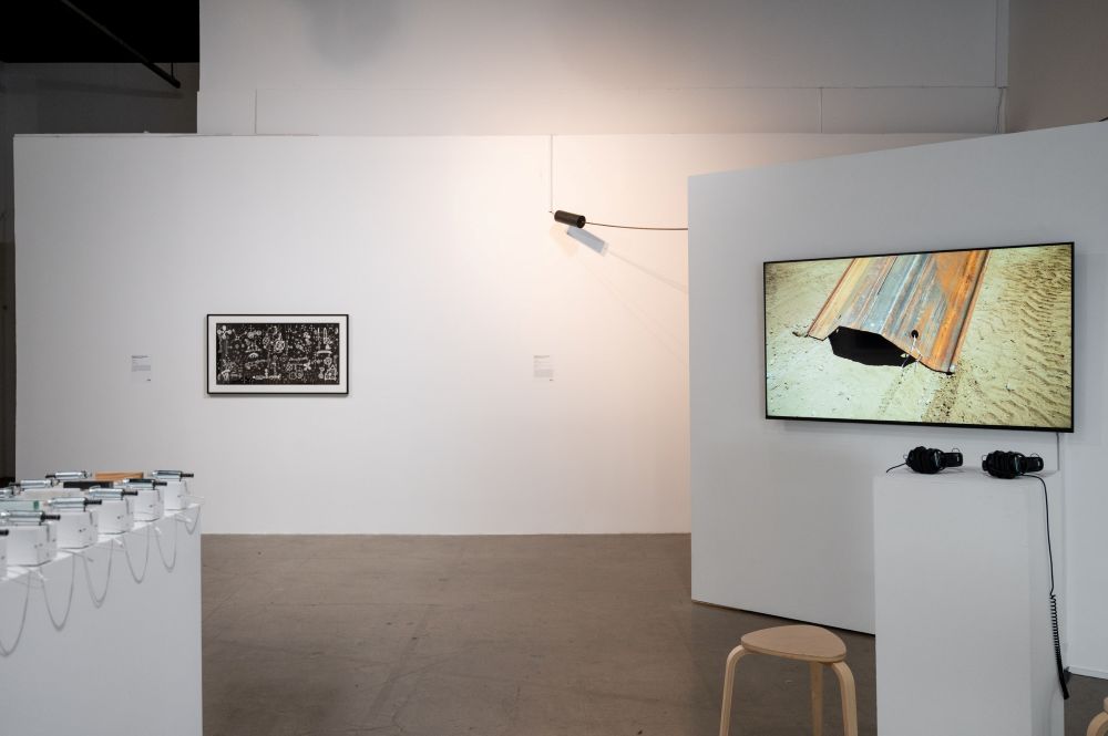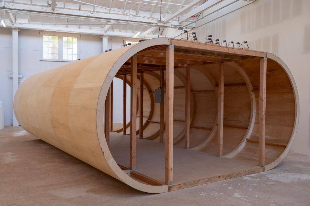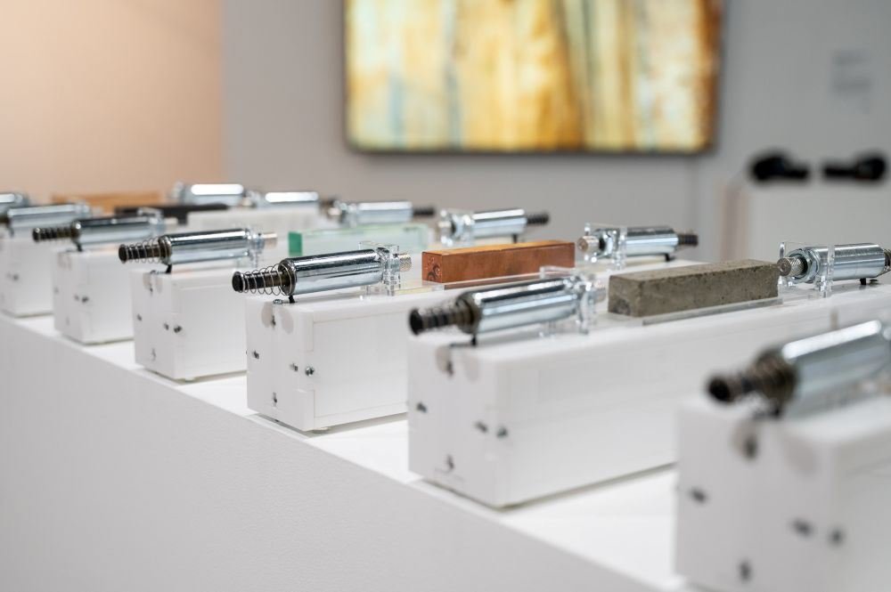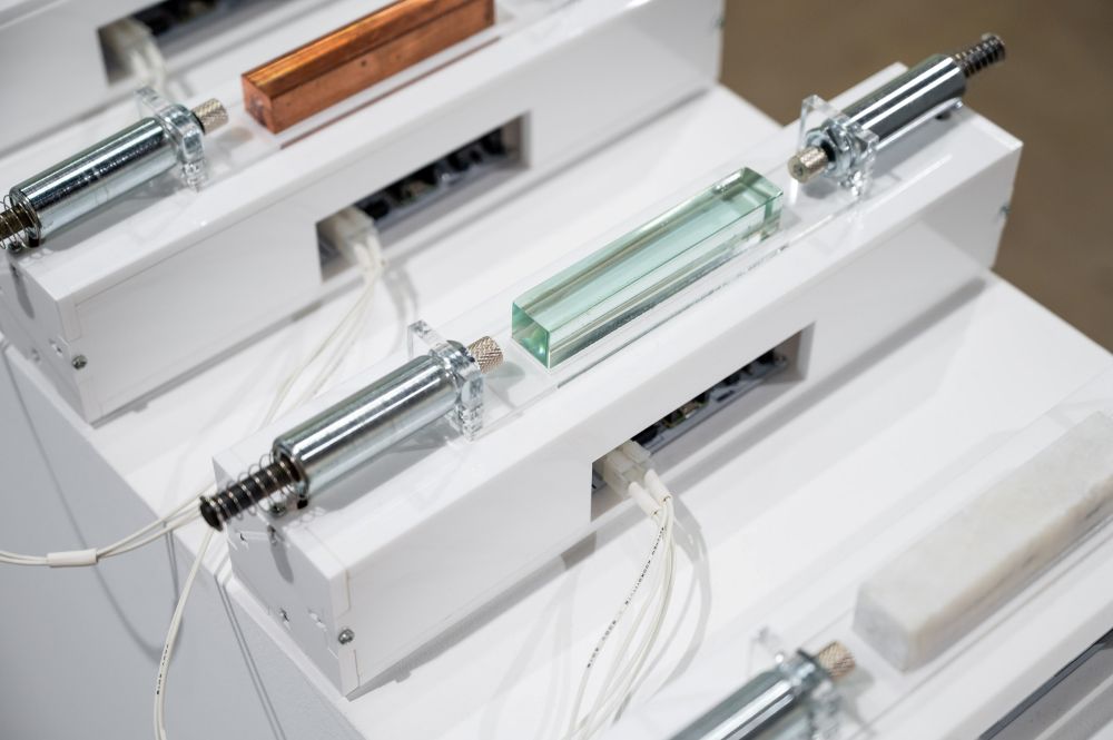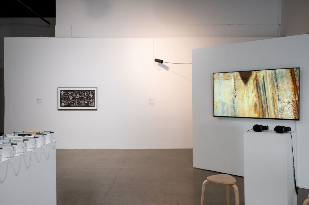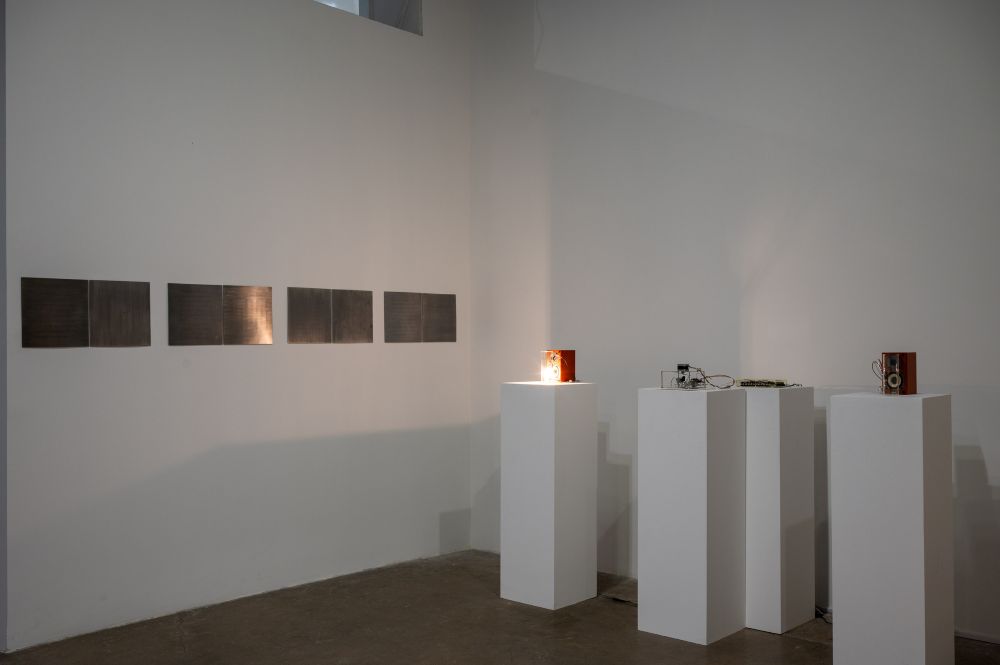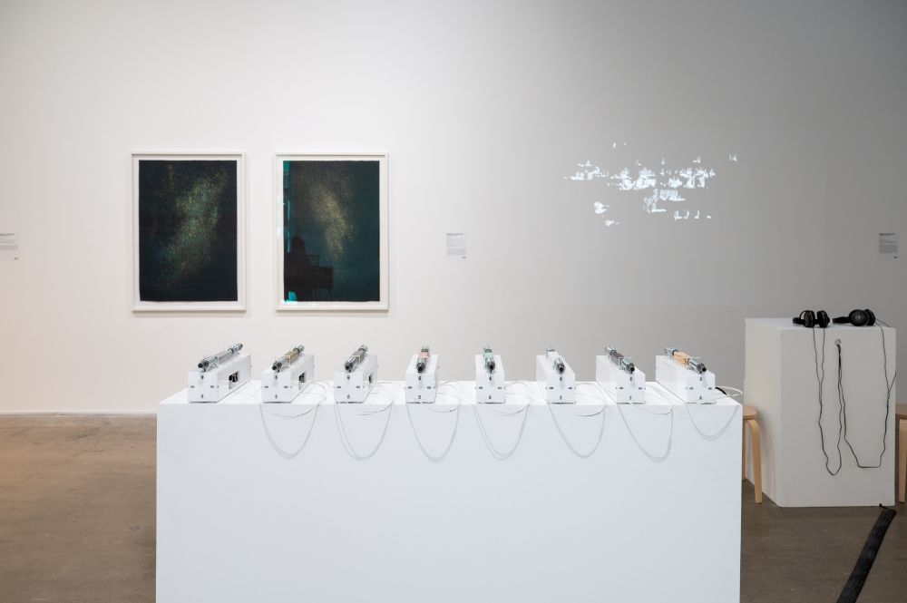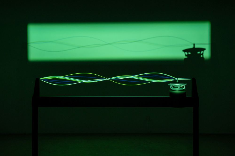 Each of the works in the exhibition speaks to a certain approach to sense-making and varied approaches to understanding the material (and immaterial) implications of vibration. David Haines and Joyce Hinterding’s Telepathy(2008)—a single-occupancy anechoic chamber—allows audiences to experience and contemplate an interior relationship to sound and vibration, that which exists within our own bodies. Steve Roden’s ear(th) (2004) deepens this idea, offering an opportunity for people to recognize the energetic nature of seismic activities in Southern California through the use of a custom-built sounding system that transposes these largely inaudible vibrations into a fluid, almost musical transposition.