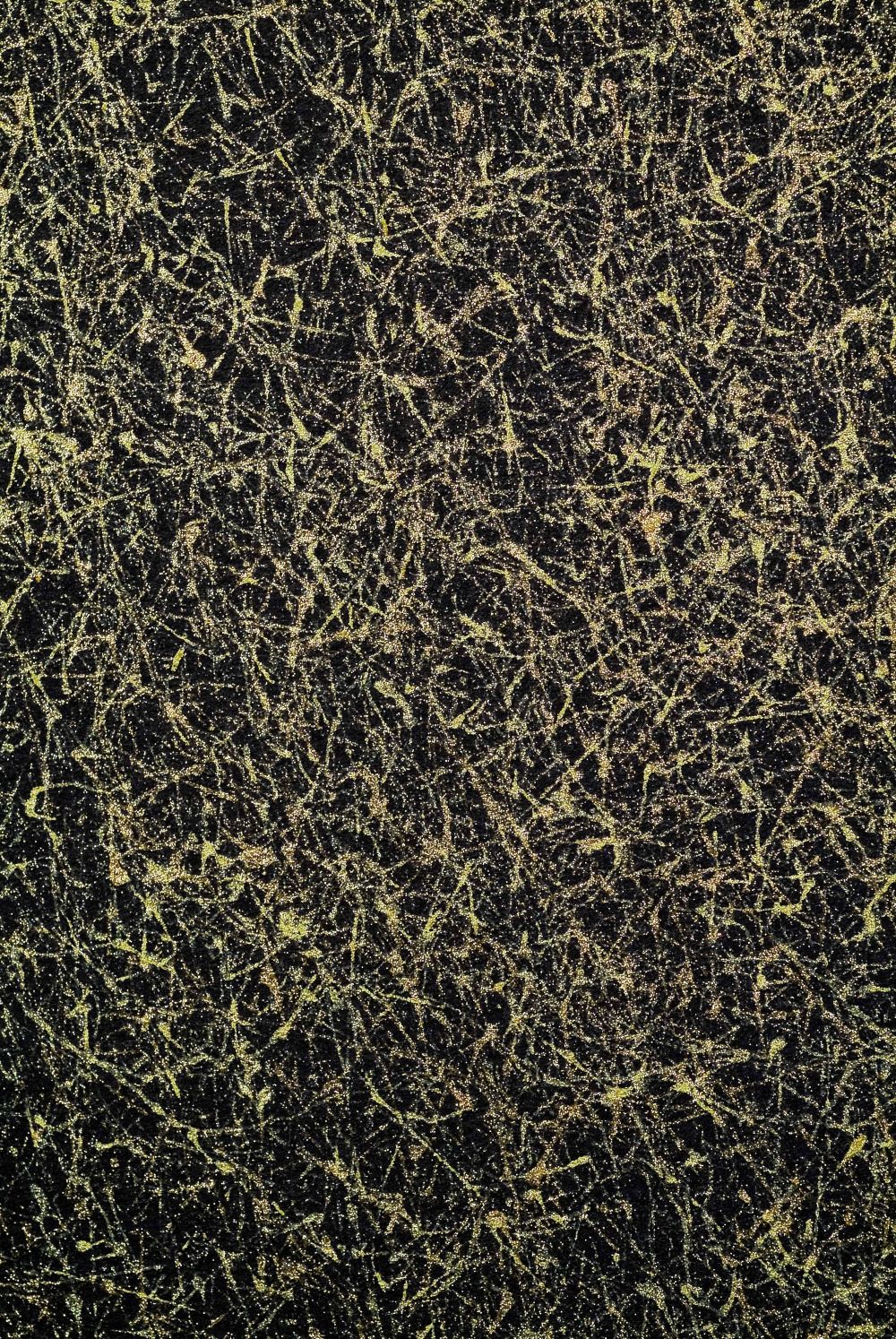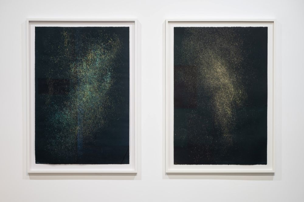 WIND, On-Shore Flow, 7 Hours of Observation, Green and Blue, 3/28/08, 2008. Metallic ink on black paper 44 ½ x 30 in. WIND, Off-Shore Flow, 10 Hours of Observation, Gold and Copper, 10/07/08, 2008. Metallic ink on black paper. 44½ x 30 in.