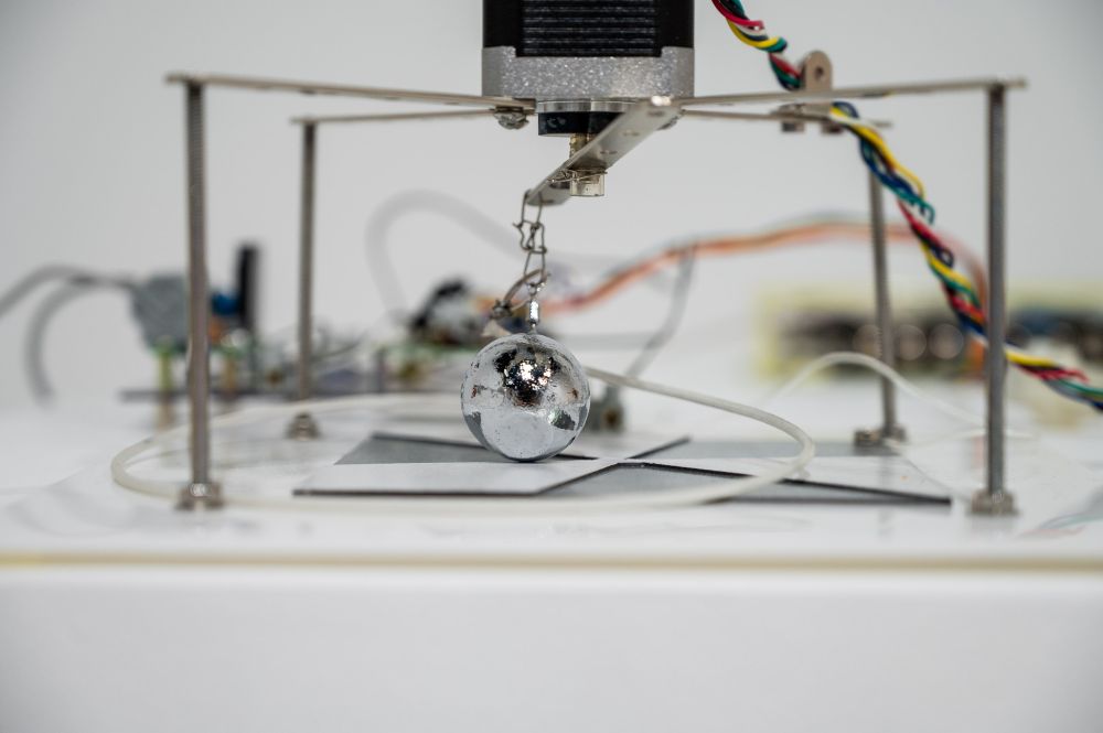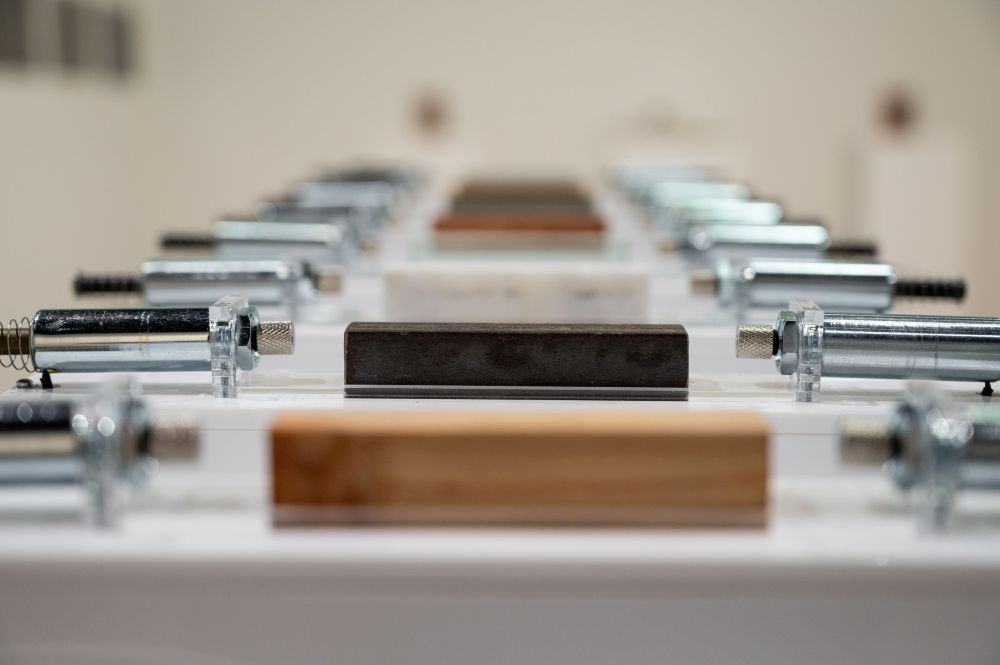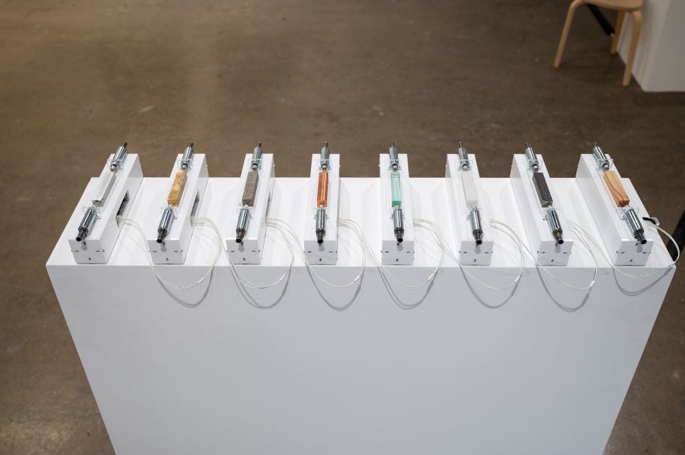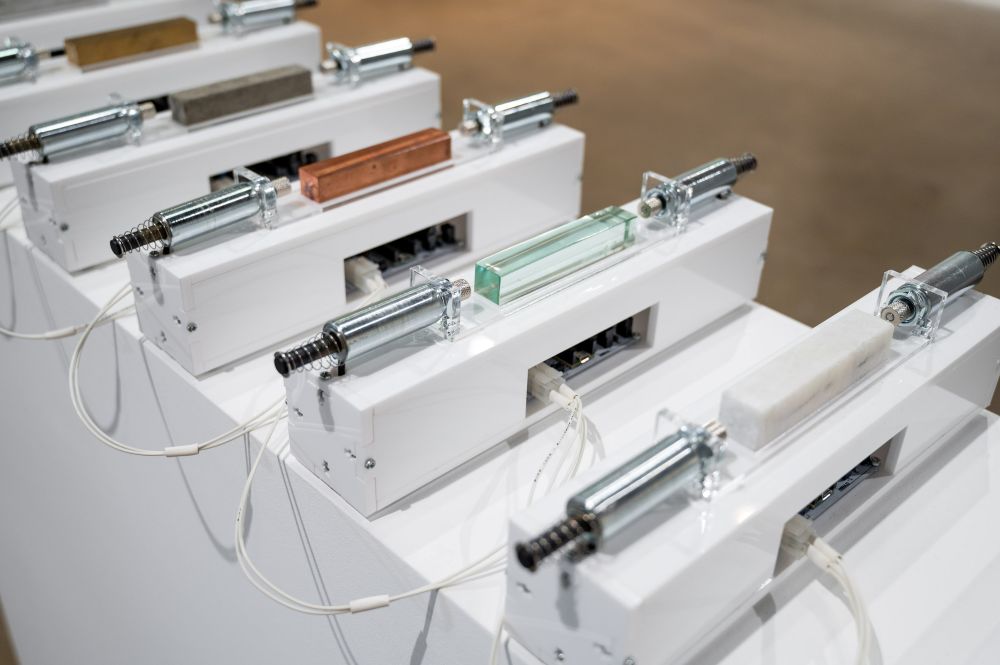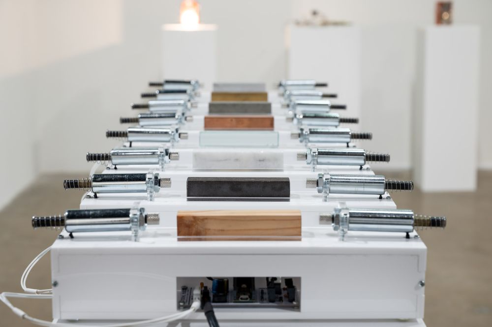 Material Music, 2019-20. Wood, metal, glass, marble, and mechanical and electronic elements 36 x