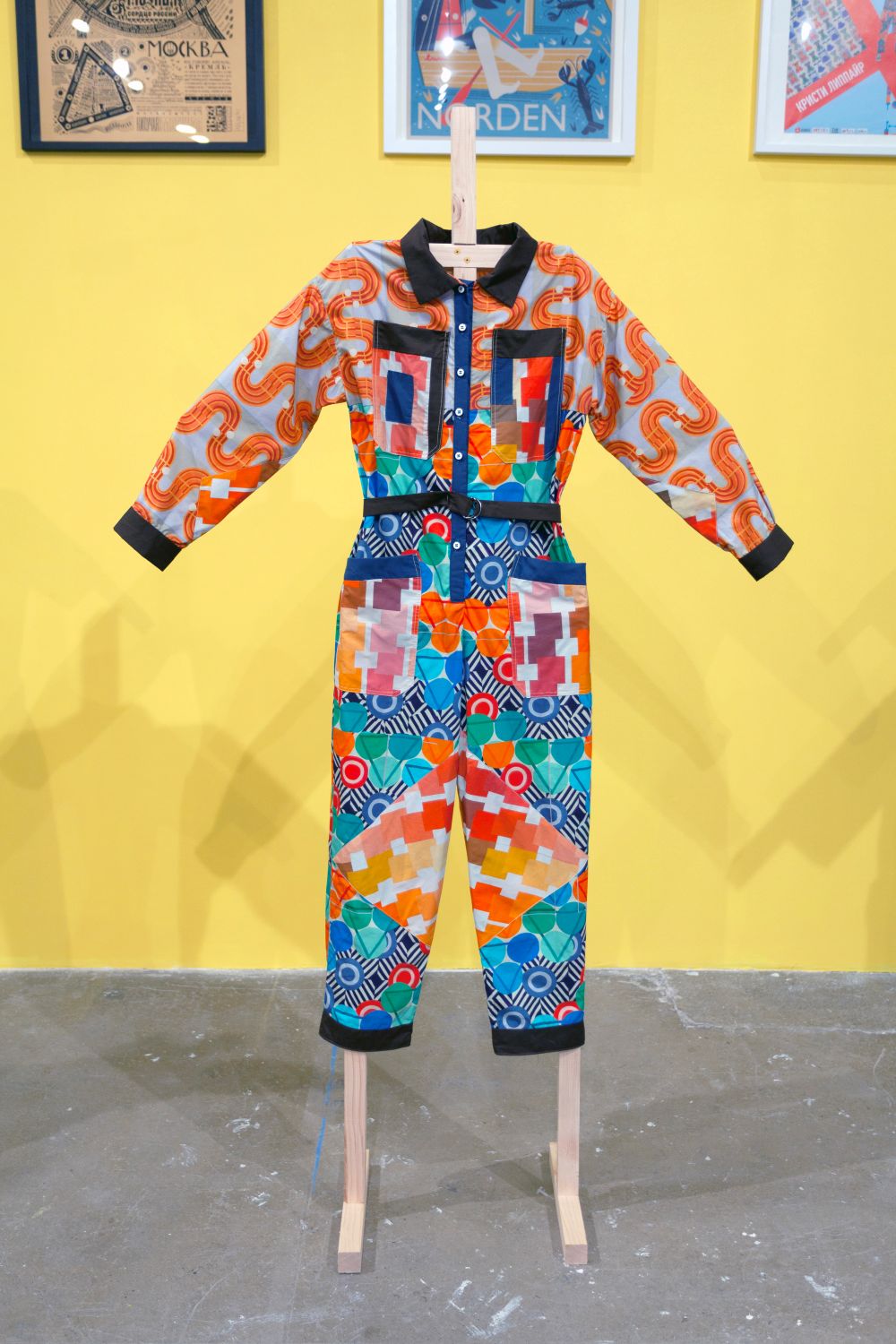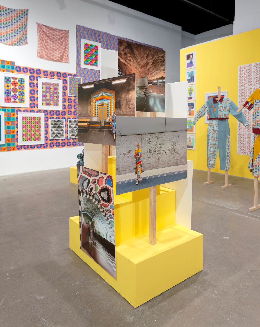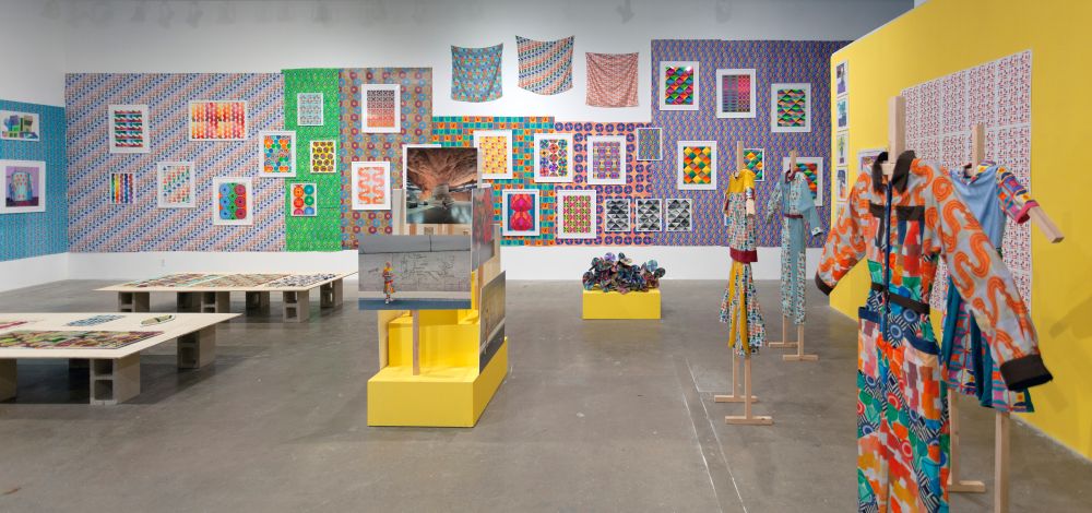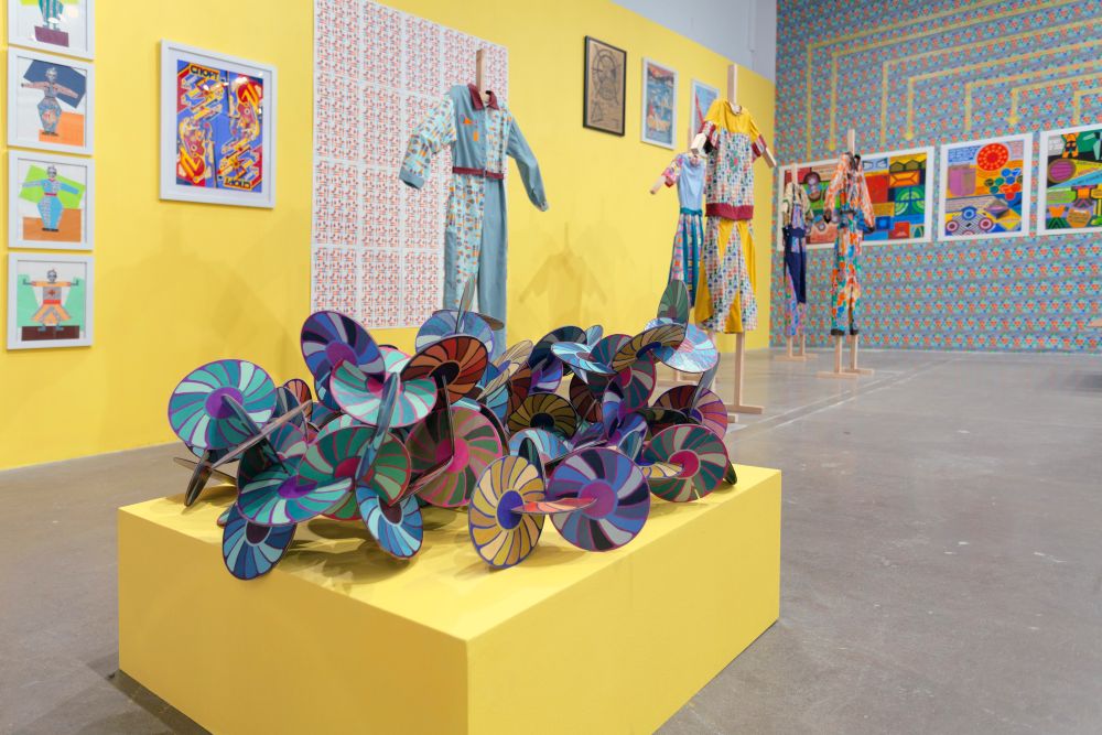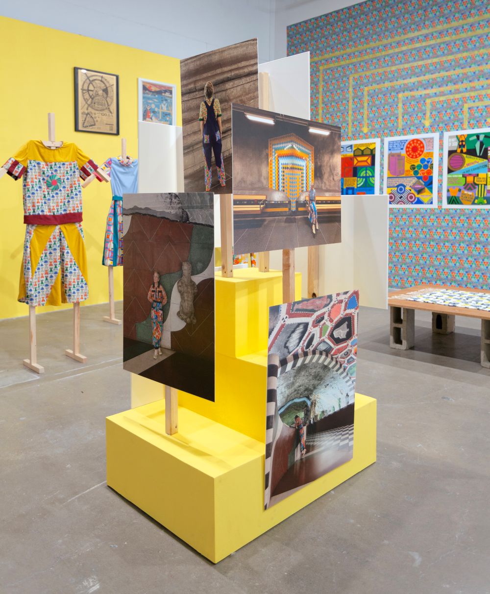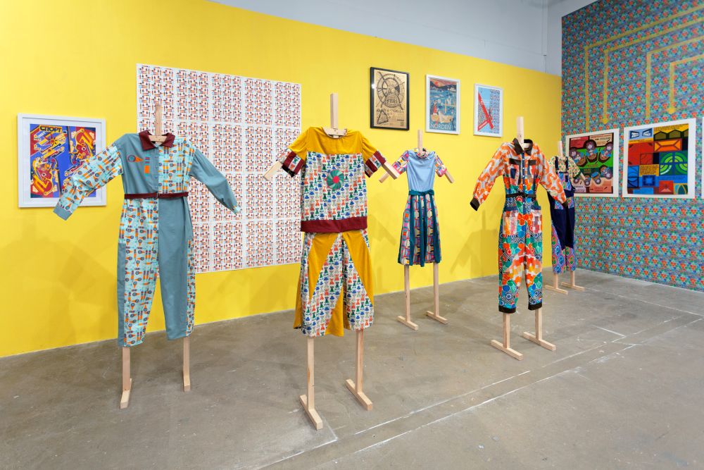 collages, garments, and photographs, flood the gallery with vivid colors and pragmatic