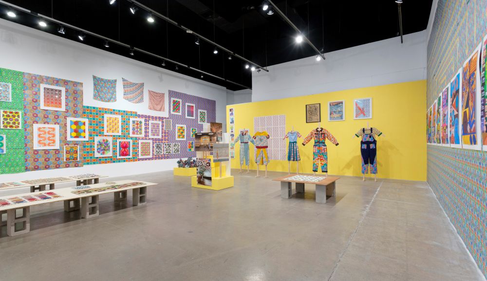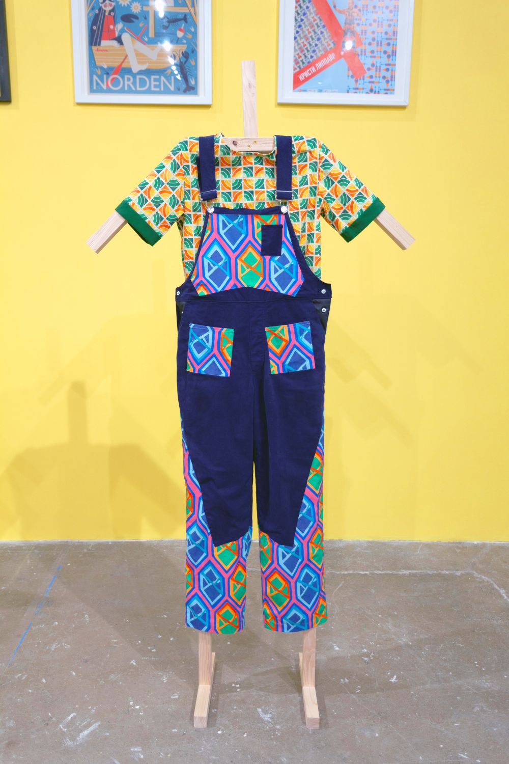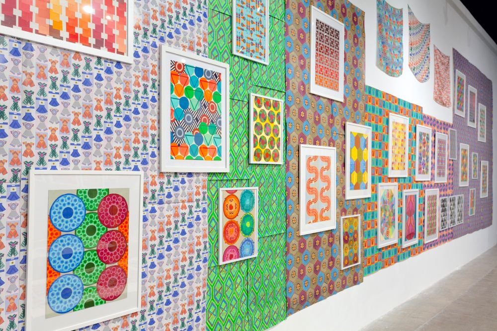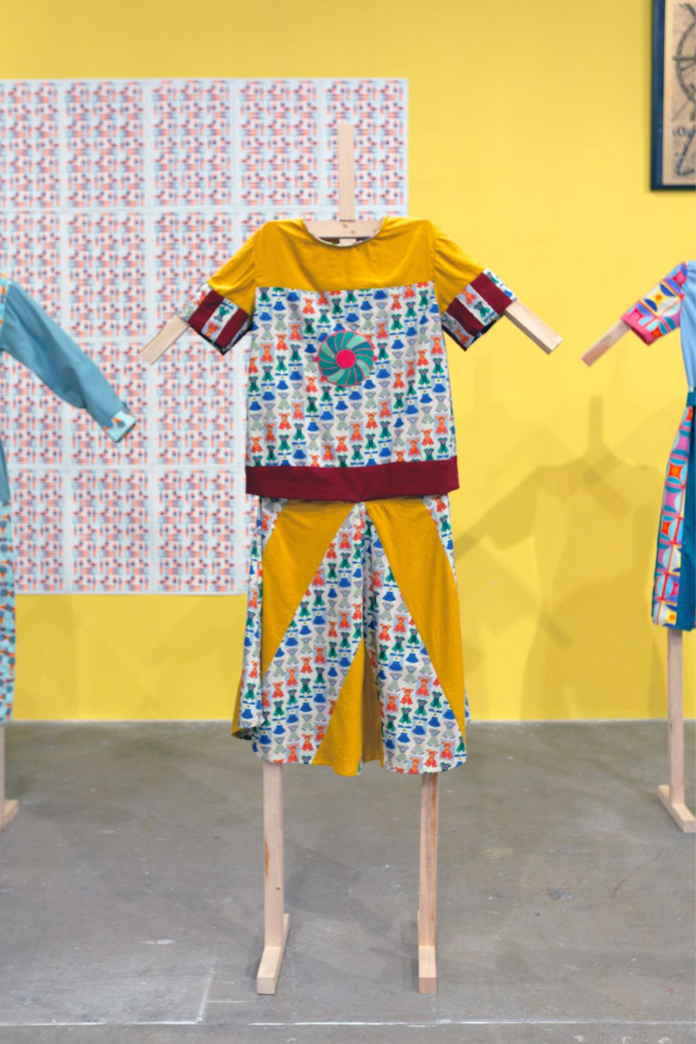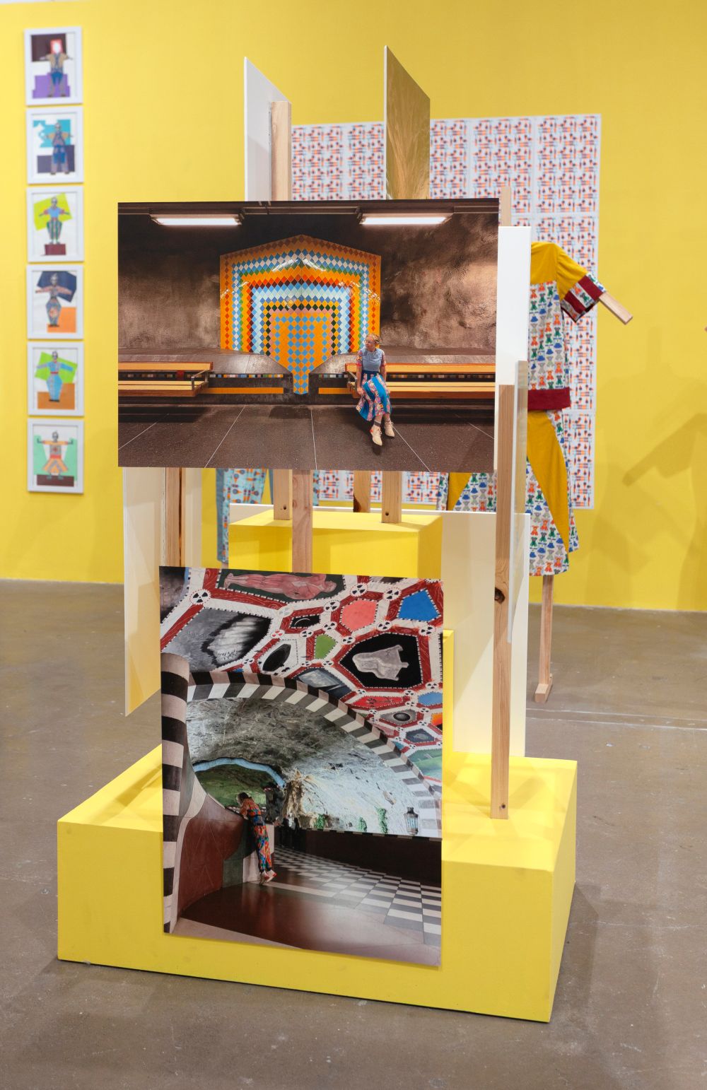 collages, garments, and photographs, flood the gallery with vivid colors and pragmatic