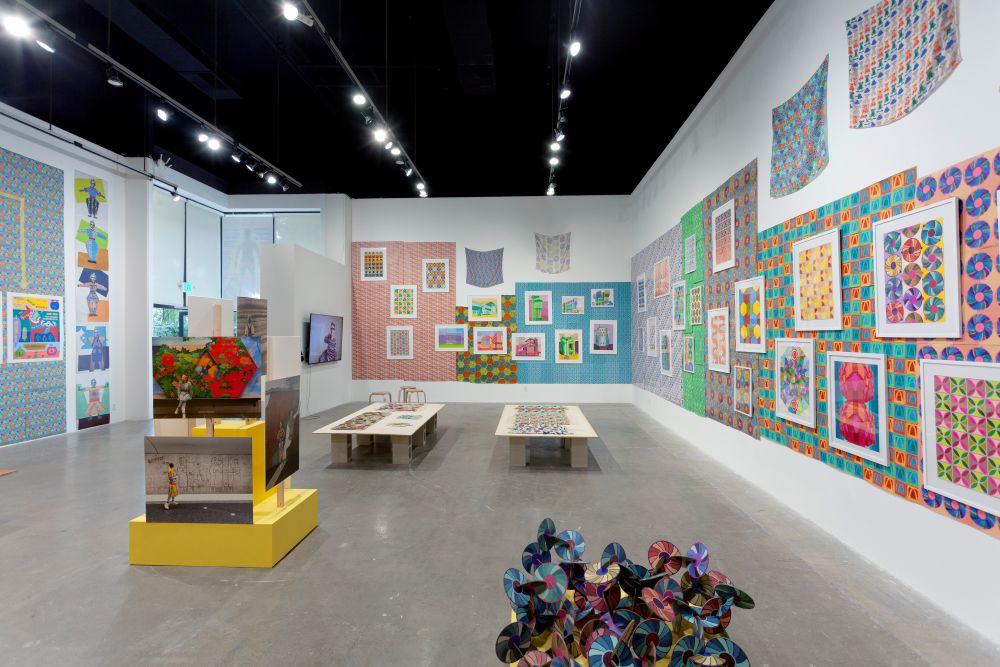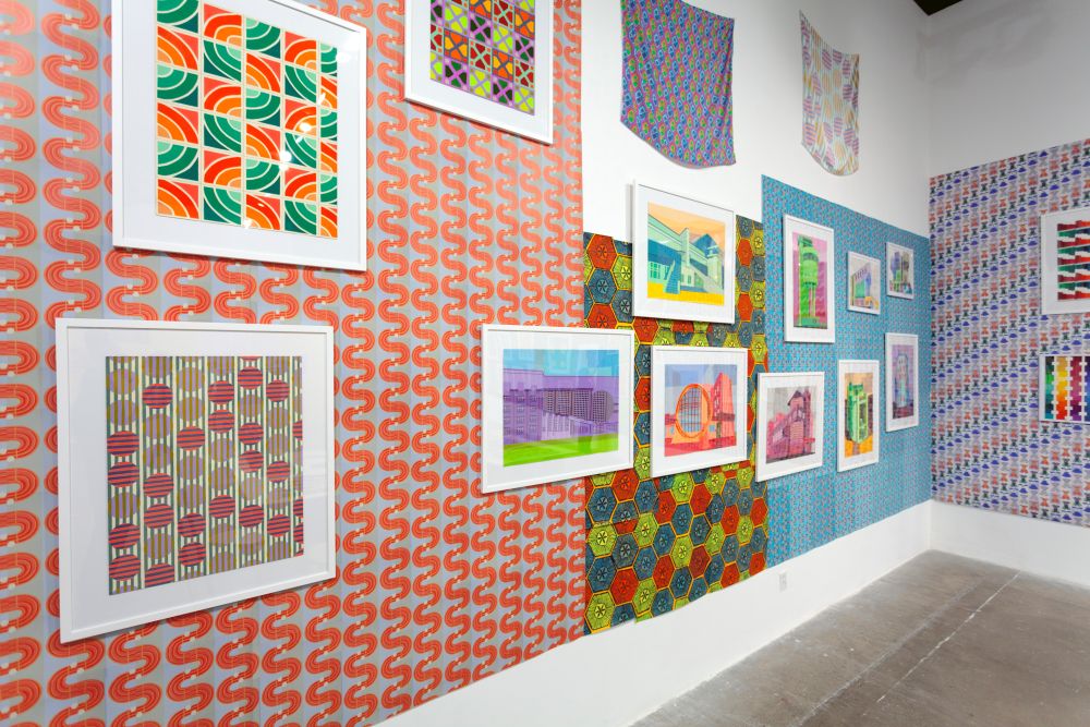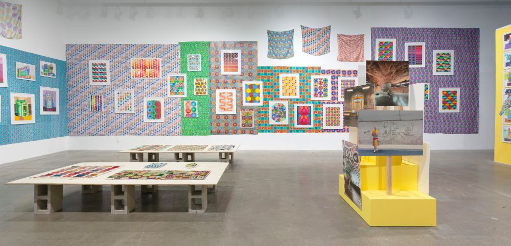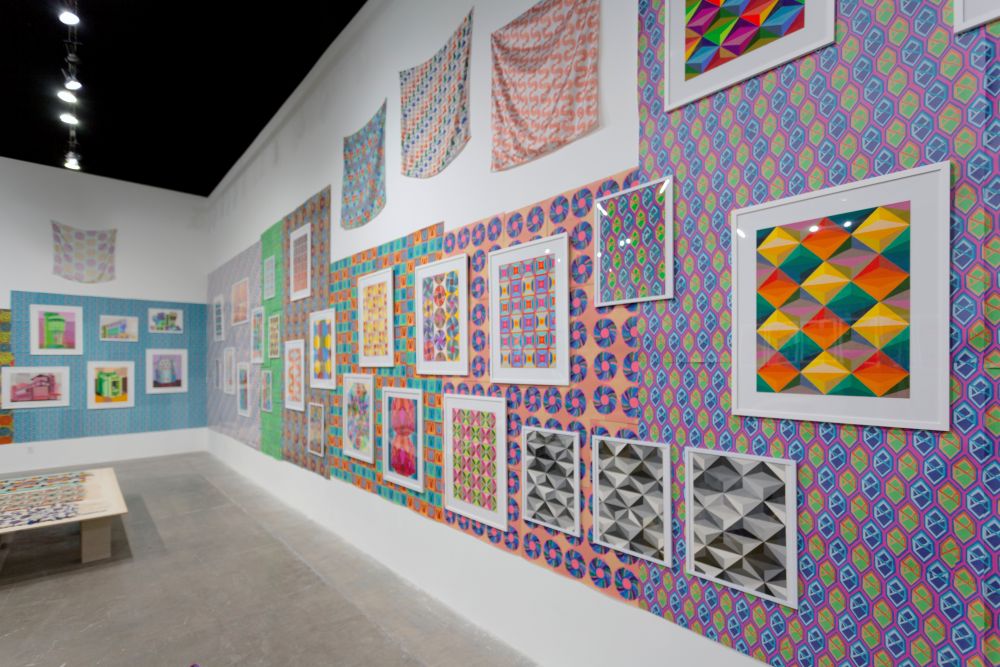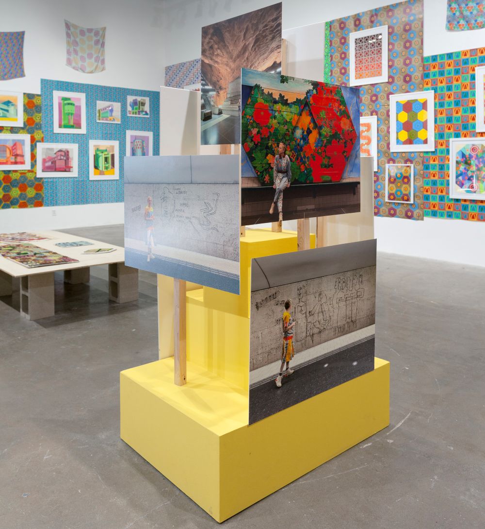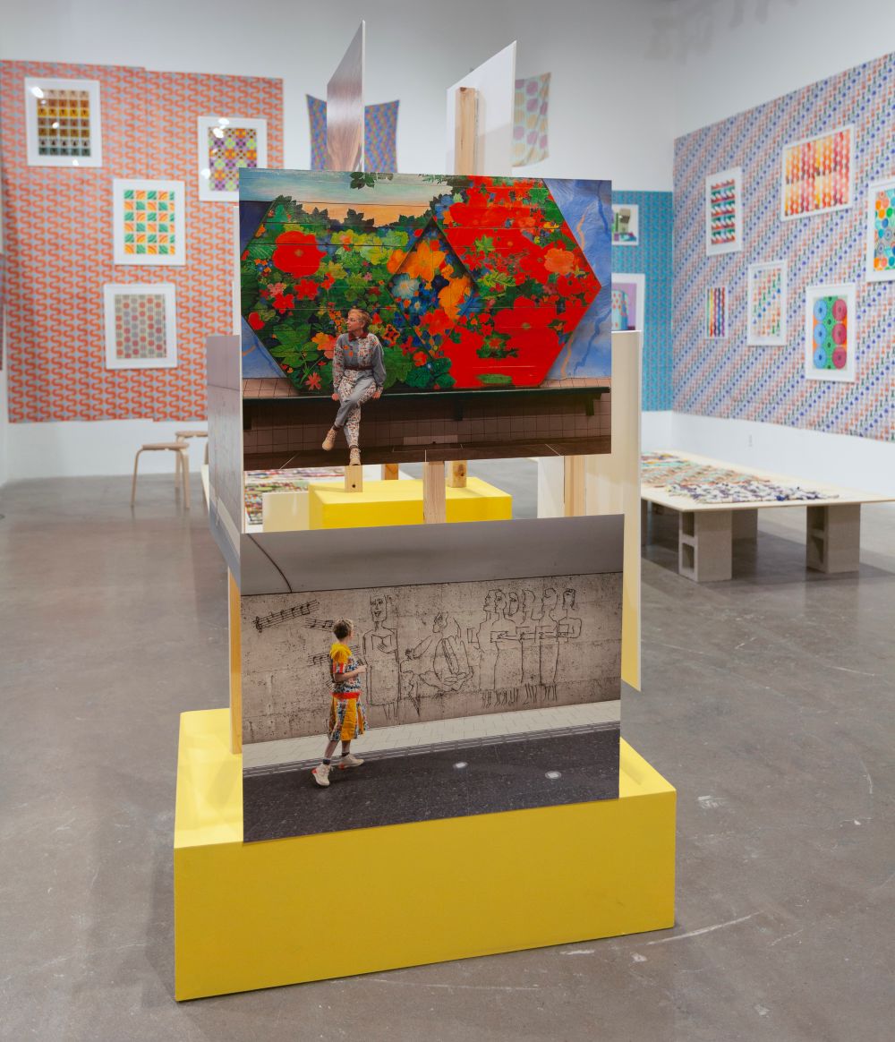 collages, garments, and photographs, flood the gallery with vivid colors and pragmatic